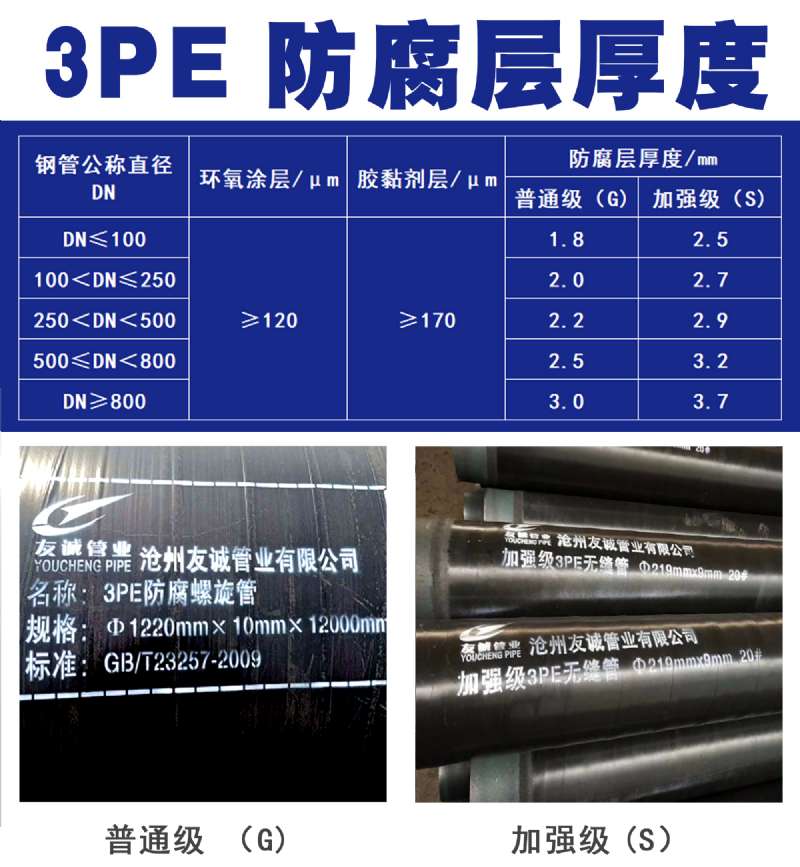 一般都聽說過3pe,但是您真正知道指的是什么嗎?友誠武建偉【13703173800】帶您做具體了解: 擠壓聚乙烯涂敷鋼管分三層PE防腐結(jié)構(gòu):一層環(huán)氧粉末(FBE>um),二層膠粘劑(AD)170至50um,三層聚乙烯(PE)2.5至3.7mm。三種材料融為一體,并